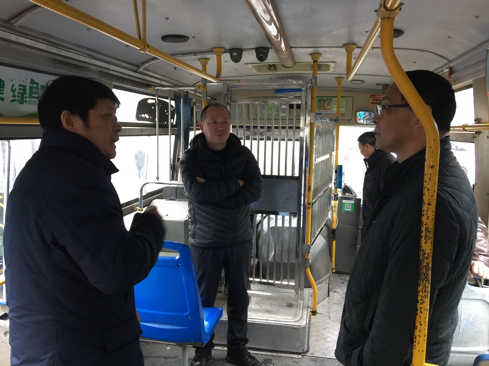1月11日上午,市政府副秘书长王华忠,市交通运输局局长周美元、副局长罗楚平,市客管处处长刘来斌,市公安内保支队副支队朱前方一行到市公交集团公司督查指导中心城区公交车生命防护装置整治专项工作。