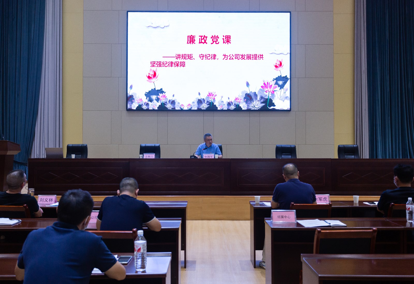 党委书记、董事长张国军同志围绕“讲规矩,守纪律,为公司发展提供坚强纪律保障”为全体干部职工讲廉政党课。党课从把握纪律规矩的科学内涵,认识讲规矩守纪律的重要性,总结讲规矩守纪律取得的工作成效,增强讲规矩守纪律的自觉性和坚定性四个方面阐述。要求广大党员干部要围绕公司发展大局、紧扣经营中心工作,把“讲规矩、守纪律”要求学到深处、落到实处,进一步加深对严明政治纪律、转变工作作风、厉行勤俭节约、克服特权思想、服务基层一线等重点问题的理解和把握,力争在提升境界、改进作风、指导实践方面有新的收获,为公司事业发展提供坚强政治和纪律保障。
