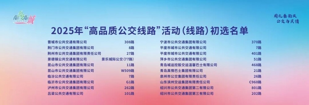 近日交通运输部2025年“我的公交我的城”主题宣传活动(宝鸡站)相关初选名单公布8路巾帼示范线入选2025年“高品质公交线路”活动初选名单。