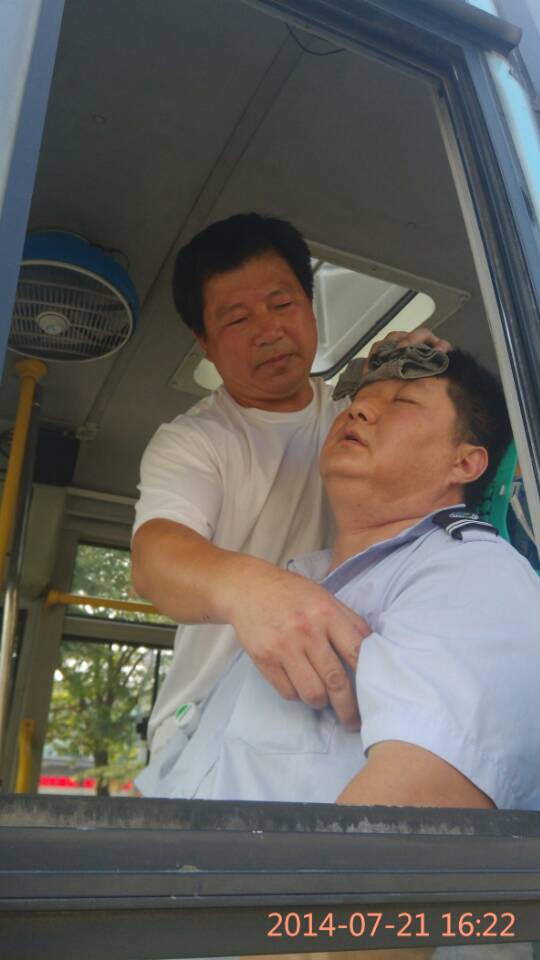 据悉,当日下午樊师傅驾驶公交车在路面上行驶时,他感觉天气特别热且车厢里也非常闷热,身体也有点不舒服,就将车速放慢了许多。本想着能坚持将这班车开完,就到终点站的员工空调房休息一下,可公交车经过事发地时,他突然一阵眩晕。出于本能,他第一反应就是刹车向右打方向盘将车停稳在路边,然后就失去了知觉。据现场的乘客介绍,樊师傅晕倒后,车内乘客参与营救他,其中一位女乘客拿着毛巾在水桶里打湿后,敷在樊师傅头上,另一位男乘客则不断掐着司机的人中穴和虎口穴,有其他人买来冰水,男乘客将冰水放在樊师傅两腋下降温。在乘客的帮助下,樊师傅慢慢缓了过来,最后被120急救车接走送至医院救治。