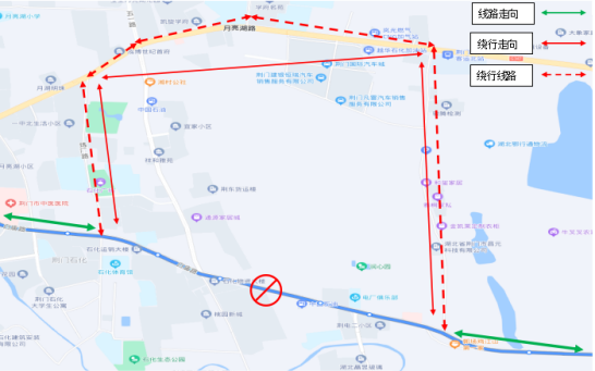 全封闭施工期间(2023年6月底至2023年8月底)往返绕行五一路、月亮湖路、江山路。
